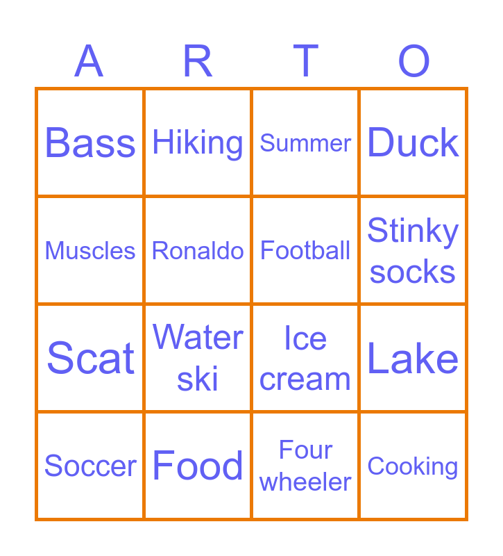 This bingo card has 49 words: Kpop, Soccer, Pelé, Volleyball, Fishing, Hockey, Hiking, Playing in woods, Ronaldo, Lacrosse, Football, Duck, Fish, Dog, Ski jumping, Timberwolves, Stinky socks, Food, Instant ramen, Muscles, Lake, Moose, Bass, Scat, Northern Pike, Water ski, Tubing, Diamond earrings, Biking, Cooking, Friends, Video games, Trampoline flips, Cannonball, Sponge bob, Minecraft, Animal crossing, Super Smash bros, Four wheeler, Fourth of july, Snowmobiling, Gigabagadawawen, Mbappe, Brownies, Ice cream, Summer, Nutella, Fry bread and Cookies.