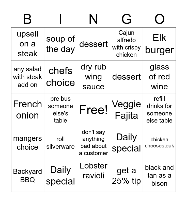 This bingo card has a free space and 29 words: Backyard BBQ, sell a hot coco, pre bus someone else's table, loaded potato, upsell on a steak, dessert, chefs choice, roll silverware, Veggie Fajita, Daily special, refill drinks for someone else table, black and tan as a bison, Lobster ravioli, get a 25% tip, glass of red wine, sell a $50 gift card, don't say anything bad about a customer, mangers choice, Elk burger, French onion, Daily special, answer the phone, dessert, any salad with steak add on, Cajun alfredo with crispy chicken, soup of the day, chicken cheesesteak, dry rub wing sauce and chicken on a salad.