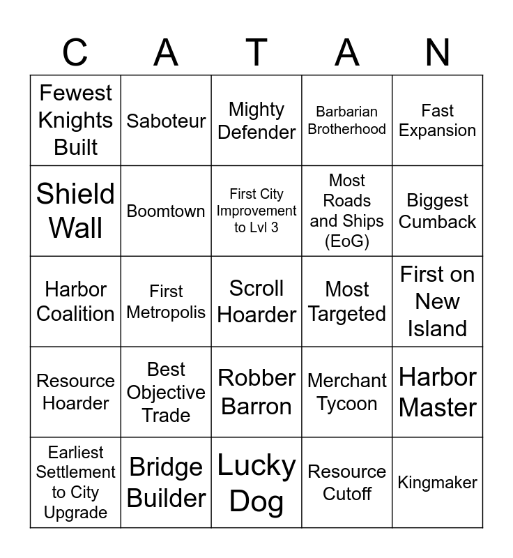 This bingo card has 25 words: Resource Hoarder, Bridge Builder, Scroll Hoarder, Resource Cutoff, Fast Expansion, Fewest Knights Built, Saboteur, Mighty Defender, Most Targeted, Harbor Master, Shield Wall, Boomtown, Lucky Dog, Merchant Tycoon, Biggest Cumback, Earliest Settlement to City Upgrade, First Metropolis, First City Improvement to Lvl 3, Most Roads and Ships (EoG), First on New Island, Harbor Coalition, Best Objective Trade, Robber Barron, Barbarian Brotherhood and Kingmaker.