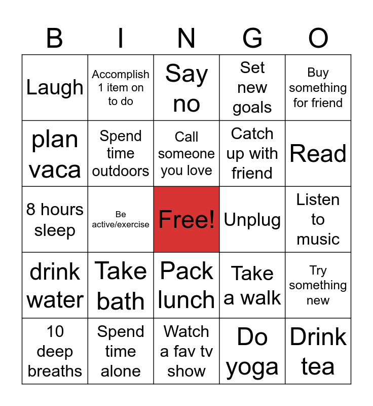 This bingo card has a free space and 40 words: Write in journal, Be active/exercise, Make gratitude list, Unplug, Validate your own feelings, 10 deep breaths, Spend time outdoors, Allow yourself to rest, Catch up with friend, Try something new, 8 hours sleep, Accomplish 1 item on to do, Do yoga, Listen to music, drink water, Take bath, Ask for help, Set new goals, Cook, Laugh, Spend time alone, Call someone you love, Take a walk, Read, Avoid drugs and alcohol, Declutter/clean, Watch a fav tv show, Eat healthy meal, Detox, Meditate, Practice hobby, Say no, Get massage, Drink tea, plan vaca, Volunteer, Pack lunch, Buy yourself a gift, Buy something for friend and Set boundary.