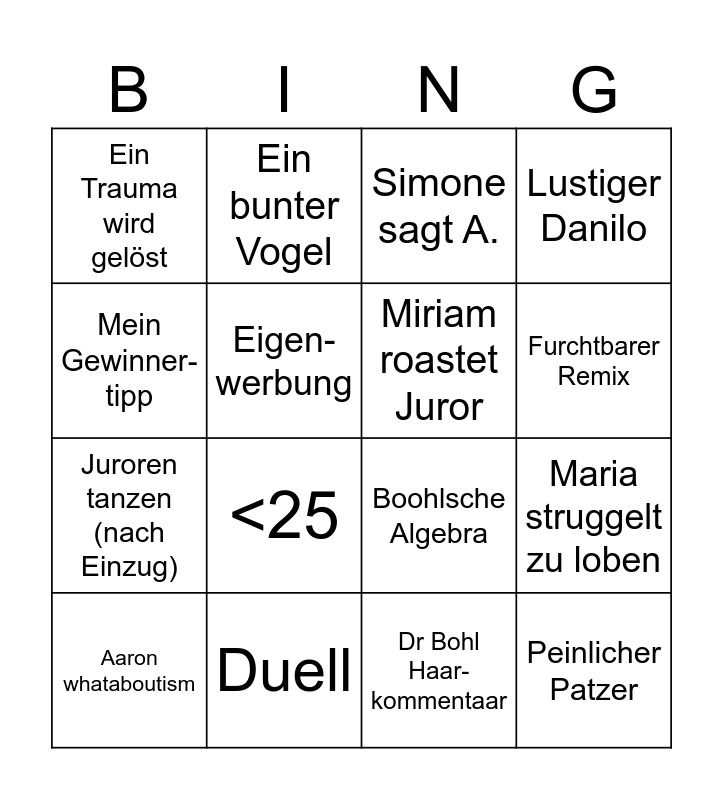 This bingo card has 16 words: Duell, Maria struggelt zu loben, Simone sagt A., Ein Trauma wird gelöst, Juroren tanzen (nach Einzug), Ein bunter Vogel, Boohlsche Algebra, Dr Bohl Haar-kommentaar, Mein Gewinner-tipp, Eigen-werbung, Aaron whataboutism, Lustiger Danilo, <25, Furchtbarer Remix, Miriam roastet Juror and Peinlicher Patzer.