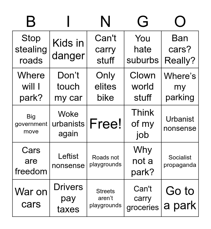 This bingo card has a free space and 48 words: North Korea vibes, Go to a park, Anti-car agenda, Streets aren’t playgrounds, Leftist nonsense, Roads are for cars, Kids in danger, Cyclists are selfish, Where will I park?, Big government overreach, Don’t touch my car, You hate suburbs, Socialist propaganda, Why not a park?, You hate drivers, I need my van, Only elites bike, Think of my job, This is Marxism, Ban cars? Really?, Woke urbanists again, Can't carry groceries, Stop stealing roads, Clown world stuff, North Korea vibes, Where’s my parking, War on cars, Leftist takeover, Roads not playgrounds, Cars are freedom, Bike lanes bad, Hate the suburbs, Won’t help workers, Woke city planning, Drivers pay taxes, Emergency vehicle excuse, Backyard not street, Urbanist nonsense, Cyclists are selfish, Cars are essential, Stop stealing roads, You hate families, Can't carry stuff, Go to park, Big government move, Think of children, Towing is theft and Not real safety.