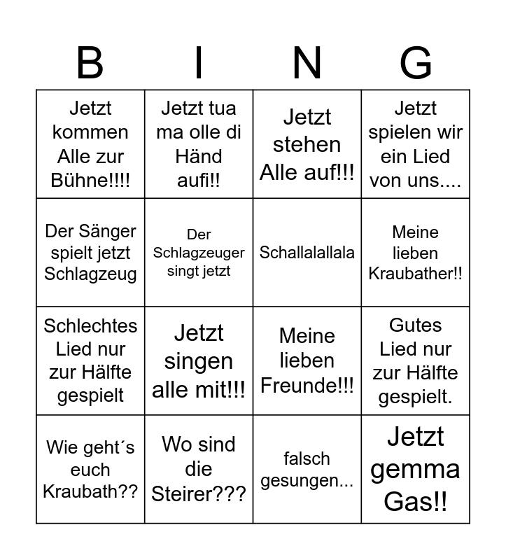 This bingo card has 16 words: Wo sind die Steirer???, Gutes Lied nur zur Hälfte gespielt., Jetzt stehen Alle auf!!!, Jetzt kommen Alle zur Bühne!!!!, Schlechtes Lied nur zur Hälfte gespielt, Jetzt tua ma olle di Händ aufi!!, Meine lieben Freunde!!!, falsch gesungen..., Der Sänger spielt jetzt Schlagzeug, Der Schlagzeuger singt jetzt, Wie geht´s euch Kraubath??, Jetzt spielen wir ein Lied von uns...., Jetzt singen alle mit!!!, Meine lieben Kraubather!!, Schallalallala and Jetzt gemma Gas!!.
