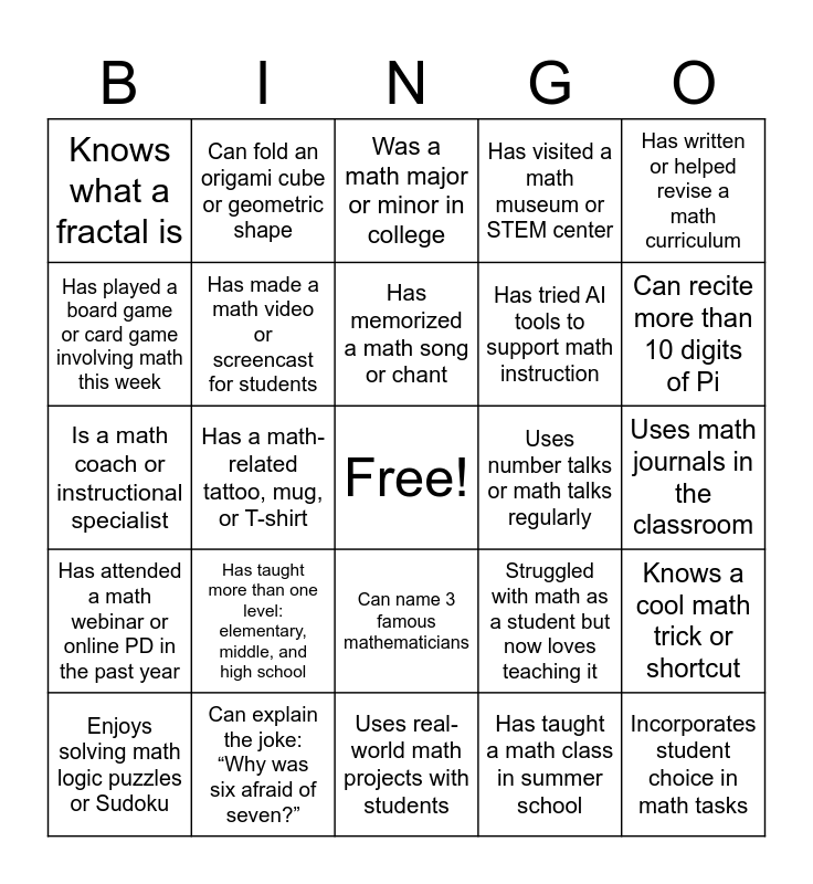 This bingo card has a free space and 29 words: Enjoys solving math logic puzzles or Sudoku, Has taken a math course beyond calculus, Has a math-related tattoo, mug, or T-shirt, Prefers geometry over algebra, Knows what a fractal is, Was a math major or minor in college, Has made a math video or screencast for students, Has taught more than one level: elementary, middle, and high school, Uses number talks or math talks regularly, Can explain the joke: “Why was six afraid of seven?”, Uses math journals in the classroom, Incorporates student choice in math tasks, Uses real-world math projects with students, Has taught a math class in summer school, Can recite more than 10 digits of Pi, Has created or used a lesson in Desmos, Can name 3 famous mathematicians, Has attended a math webinar or online PD in the past year, Has written or helped revise a math curriculum, Is a math coach or instructional specialist, Struggled with math as a student but now loves teaching it, Has presented at a math conference, Has tried AI tools to support math instruction, Has played a board game or card game involving math this week, Has visited a math museum or STEM center, Can fold an origami cube or geometric shape, Knows a cool math trick or shortcut, Has memorized a math song or chant and Has built or fixed something using measurement or estimation.