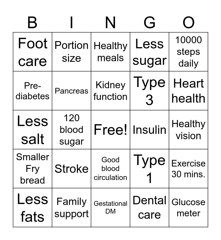 This bingo card has a free space and 27 words: Type 1, Type 2, Type 3, Gestational DM, Pre-diabetes, Healthy meals, Portion size, Smaller Fry bread, Insulin, Exercise 30 mins., Less salt, Less sugar, Less fats, Family support, Heart health, Limit screen time, Pancreas, Kidney function, Stroke, Foot care, Healthy vision, Dental care, 120 blood sugar, Glucose meter, Good blood circulation, 10000 steps daily and walking.