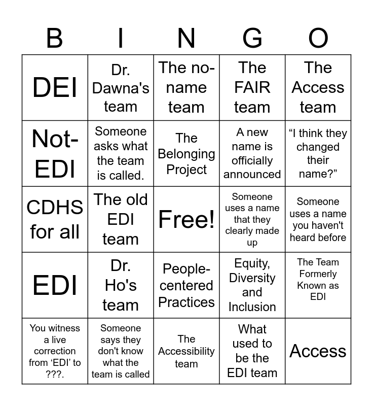 This bingo card has a free space and 24 words: Dr. Ho's team, Someone says they don't know what the team is called, The Belonging Project, You witness a live correction from ‘EDI’ to ???., The Access team, DEI, Not-EDI, Dr. Dawna's team, Someone uses a name that they clearly made up, People-centered Practices, A new name is officially announced, CDHS for all, Equity, Diversity and Inclusion, The Team Formerly Known as EDI, Someone asks what the team is called., What used to be the EDI team, Someone uses a name you haven't heard before, The no-name team, “I think they changed their name?”, The old EDI team, Access, EDI, The FAIR team and The Accessibility team.