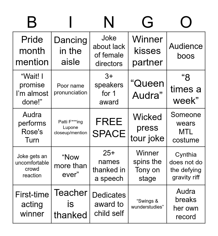 This bingo card has a free space and 29 words: First-time acting winner, Parent as a +1, Patti F***ing Lupone closeup/mention, Cynthia does the defying gravity riff, Pride month mention, Joke about lack of female directors, Poor name pronunciation, “Now more than ever”, Wicked press tour joke, Teacher is thanked, Someone wears MTL costume, Audra breaks her own record, Dedicates award to child self, “Swings & wunderstudies”, “8 times a week”, Jonathan Groff spit joke, 25+ names thanked in a speech, Joke gets an uncomfortable crowd reaction, Audience boos, Audra performs Rose's Turn, Winner spins the Tony on stage, Ariana Grande surprise appearance, “Queen Audra”, “Wait! I promise I’m almost done!”, Winner kisses partner, Dancing in the aisle, Cynthia does not do the defying gravity riff, 3+ speakers for 1 award and accidental camera angle.