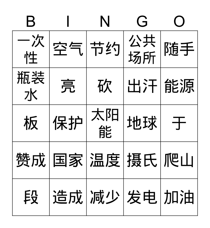 This bingo card has a free space and 24 words: 国家, 造成, 砍, 段, 随手, 一次性, 瓶装水, 空气, 地球, 温度, 出汗, 板, 摄氏, 爬山, 亮, 发电, 于, 节约, 能源, 保护, 加油, 赞成, 公共场所 and 减少.