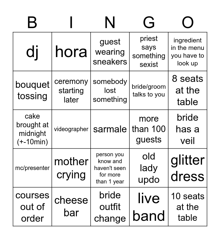 This bingo card has 50 words: photo corner/booth, sarmale, cake fireworks, bride outfit change, mother crying, drunk uncle, hora, food nobody at the table eats, bouquet tossing, smoke machine for first dance, ceremony starting later, priest says something sexist, glitter dress, old lady updo, somebody smoking weed, somebody throwing up, somebody lost something, more than 100 guests, empty chair at table, ingredient in the menu you have to look up, videographer, live band, dj, bride/groom talks to you, food everybody at the table likes, 10 seats at the table, 8 seats at the table, garter thingy, guest wearing sneakers, person you know and haven't seen for more than 1 year, speech, surprise guest, surprise event, wedding planner spotted, cheese bar, chocolate fountain, ed sheeran/taylor swift first dance song, family drama, something doesn't go according to plan, bride has a veil, edible marturii, decor objects as marturii, line at the restroom, wedding lasts longer than 2 a.m., courses out of order, cake brought at midnight (+-10min), "just married" sign, barefoot dancing, mc/presenter and groom has bowtie.