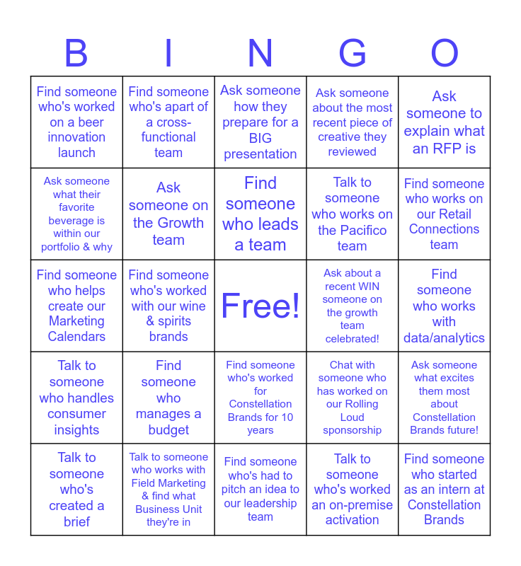 This bingo card has a free space and 24 words: Find someone who manages a budget, Talk to someone who works with Field Marketing & find what Business Unit they're in, Find someone who leads a team, Talk to someone who's created a brief, Ask someone to explain what an RFP is, Find someone who's worked on a beer innovation launch, Ask someone what their favorite beverage is within our portfolio & why, Find someone who's apart of a cross-functional team, Ask about a recent WIN someone on the growth team celebrated!, Find someone who's worked for Constellation Brands for 10 years, Talk to someone who works on the Pacifico team, Find someone who helps create our Marketing Calendars, Chat with someone who has worked on our Rolling Loud sponsorship, Ask someone what excites them most about Constellation Brands future!, Ask someone on the Growth team, Talk to someone who's worked an on-premise activation, Find someone who works with data/analytics, Ask someone how they prepare for a BIG presentation, Find someone who works on our Retail Connections team, Find someone who's worked with our wine & spirits brands, Find someone who started as an intern at Constellation Brands, Talk to someone who handles consumer insights, Ask someone about the most recent piece of creative they reviewed and Find someone who's had to pitch an idea to our leadership team.