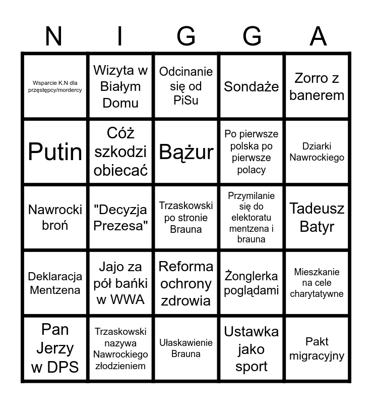 This bingo card has a free space and 24 words: Pan Jerzy w DPS, Jajo za pół bańki w WWA, Bążur, Ustawka jako sport, Zorro z banerem, Wsparcie K.N dla przęstępcy/mordercy, Wizyta w Białym Domu, Odcinanie się od PiSu, Przymilanie się do elektoratu mentzena i brauna, Tadeusz Batyr, Nawrocki broń, Cóż szkodzi obiecać, Żonglerka poglądami, Mieszkanie na cele charytatywne, Putin, Trzaskowski nazywa Nawrockiego złodzieniem, Ułaskawienie Brauna, Sondaże, Dziarki Nawrockiego, Deklaracja Mentzena, "Decyzja Prezesa", Reforma ochrony zdrowia, Po pierwsze polska po pierwsze polacy and Pakt migracyjny.