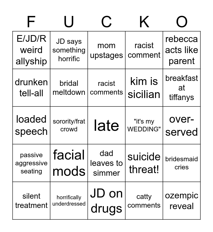 This bingo card has 25 words: facial mods, JD on drugs, racist comments, silent treatment, rebecca acts like parent, E/JD/R weird allyship, drunken tell-all, JD says something horrific, "it's my WEDDING", dad leaves to simmer, kim is sicilian, loaded speech, suicide threat!, bridesmaid cries, bridal meltdown, ozempic reveal, over- served, mom upstages, breakfast at tiffanys, sorority/frat crowd, late, horrifically underdressed, passive aggressive seating, racist comment and catty comments.