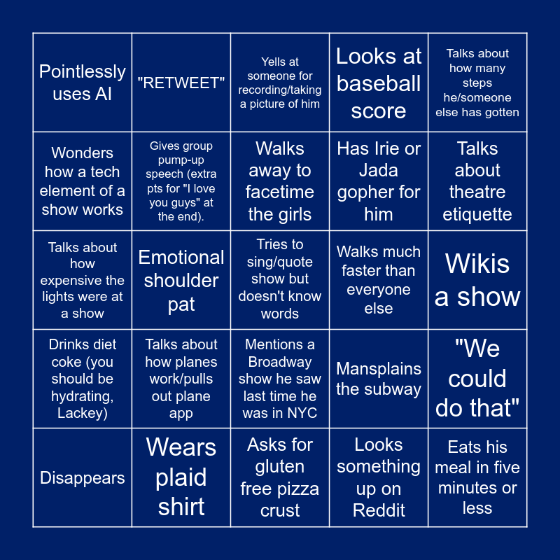 This bingo card has 25 words: Talks about how planes work/pulls out plane app, Asks for gluten free pizza crust, Walks away to facetime the girls, Disappears, Talks about how many steps he/someone else has gotten, Pointlessly uses AI, Wonders how a tech element of a show works, "RETWEET", Walks much faster than everyone else, Mentions a Broadway show he saw last time he was in NYC, Has Irie or Jada gopher for him, Talks about how expensive the lights were at a show, Mansplains the subway, "We could do that", Gives group pump-up speech (extra pts for "I love you guys" at the end)., Eats his meal in five minutes or less, Wikis a show, Yells at someone for recording/taking a picture of him, Talks about theatre etiquette, Emotional shoulder pat, Tries to sing/quote show but doesn't know words, Wears plaid shirt, Drinks diet coke (you should be hydrating, Lackey), Looks at baseball score and Looks something up on Reddit.