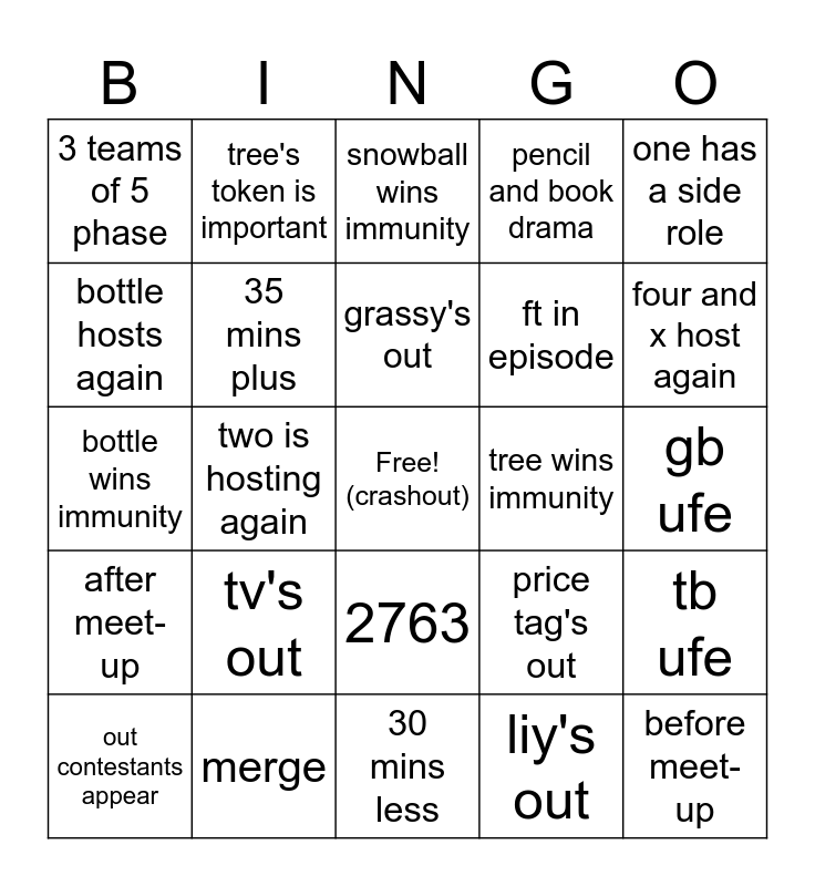 This bingo card has a free space and 24 words: tv's out, merge, grassy's out, out contestants appear, one has a side role, 3 teams of 5 phase, bottle hosts again, tree's token is important, tree wins immunity, 2763, ft in episode, bottle wins immunity, price tag's out, tb ufe, 35 mins plus, liy's out, gb ufe, snowball wins immunity, four and x host again, two is hosting again, before meet-up, after meet-up, pencil and book drama and 30 mins less.