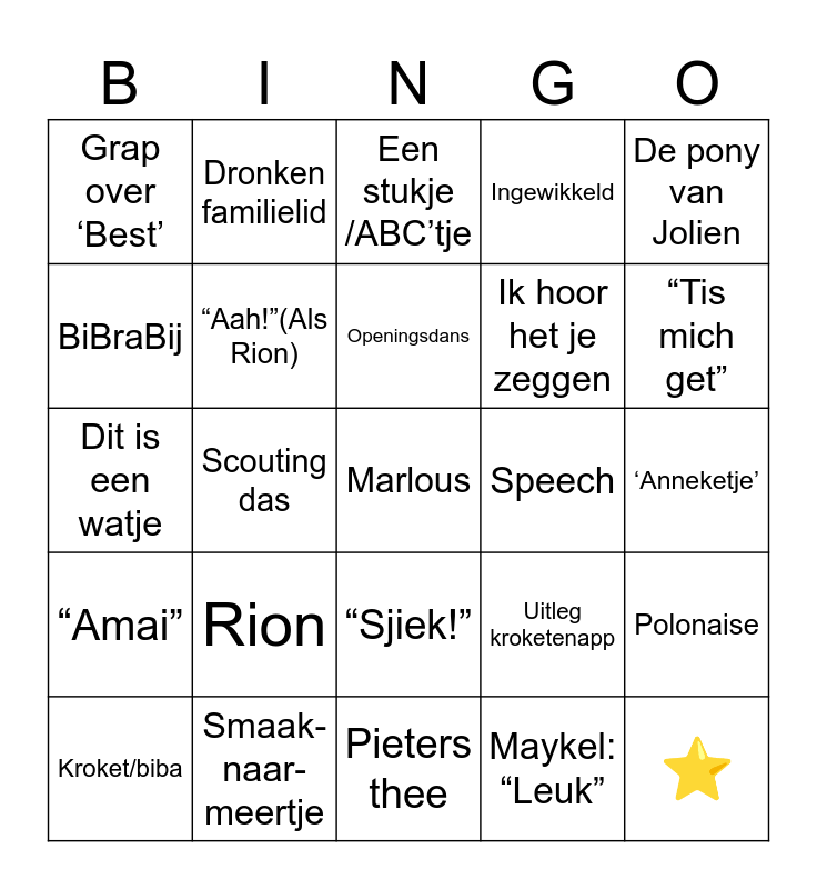 This bingo card has a free space and 29 words: Kroket/biba, Ruitjes blouse, Scouting das, Bruidstaart, Grap over ‘Best’, Een stukje /ABC’tje, “Aah!”(Als Rion), Rion, Speech, Smaak-naar-meertje, ‘Anneketje’, ⭐️, Pieters thee, Maykel: “Leuk”, “Tis mich get”, DJ, “Sjiek!”, “Amai”, De pony van Jolien, Dit is een watje, Uitleg kroketenapp, Waar van akte, Ik hoor het je zeggen, BiBraBij, Ingewikkeld, Dronken familielid, Polonaise, Openingsdans and Iemand huilt.