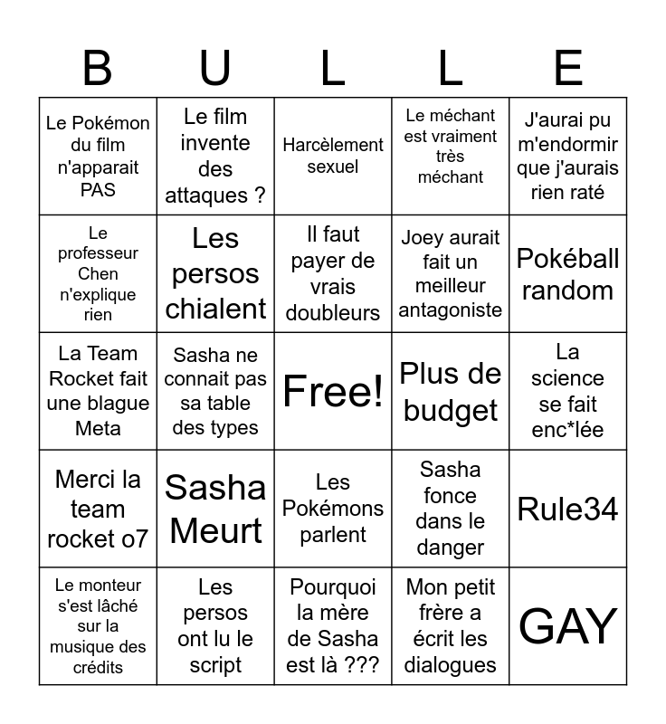 This bingo card has a free space and 24 words: Sasha Meurt, Les persos ont lu le script, Il faut payer de vrais doubleurs, Le monteur s'est lâché sur la musique des crédits, J'aurai pu m'endormir que j'aurais rien raté, Le Pokémon du film n'apparait PAS, Le professeur Chen n'explique rien, Le film invente des attaques ?, Plus de budget, Les Pokémons parlent, Joey aurait fait un meilleur antagoniste, La Team Rocket fait une blague Meta, Sasha fonce dans le danger, Rule34, Les persos chialent, Mon petit frère a écrit les dialogues, La science se fait enc*lée, Harcèlement sexuel, Pokéball random, Sasha ne connait pas sa table des types, GAY, Merci la team rocket o7, Le méchant est vraiment très méchant and Pourquoi la mère de Sasha est là ???.