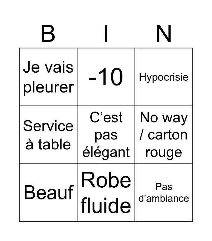 This bingo card has a free space and 8 words: No way / carton rouge, Hypocrisie, -10, Beauf, Je vais pleurer, Pas d’ambiance, Service à table and Robe fluide.