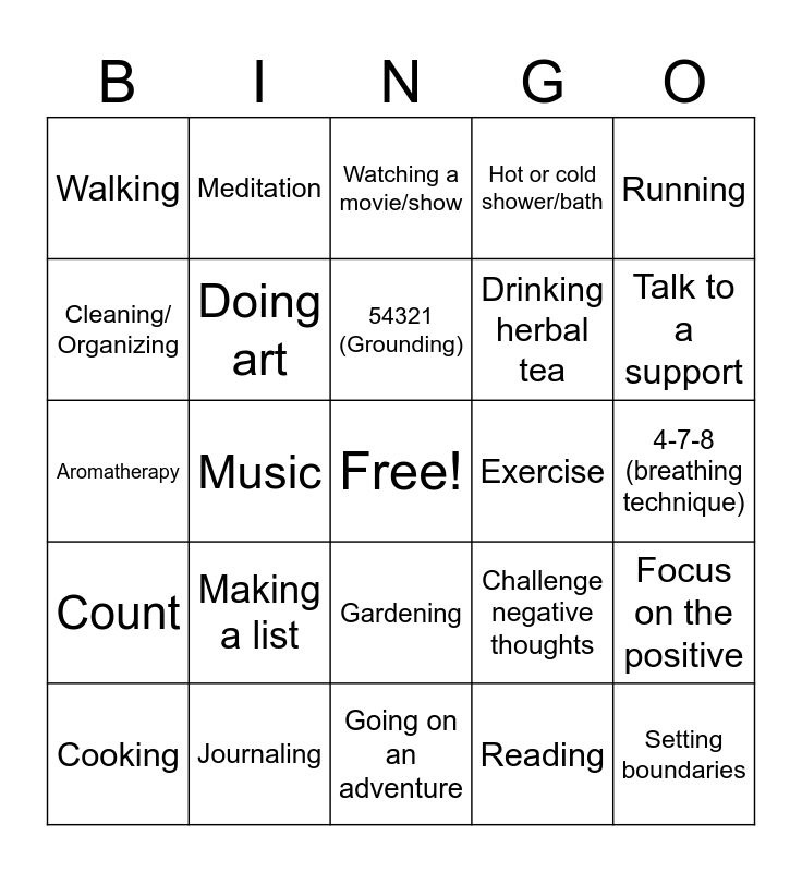 This bingo card has a free space and 24 words: Making a list, Journaling, 54321 (Grounding), Cooking, Running, Walking, Cleaning/ Organizing, Meditation, Exercise, Gardening, Drinking herbal tea, Aromatherapy, Challenge negative thoughts, Focus on the positive, Doing art, Reading, 4-7-8 (breathing technique), Watching a movie/show, Talk to a support, Music, Setting boundaries, Count, Hot or cold shower/bath and Going on an adventure.
