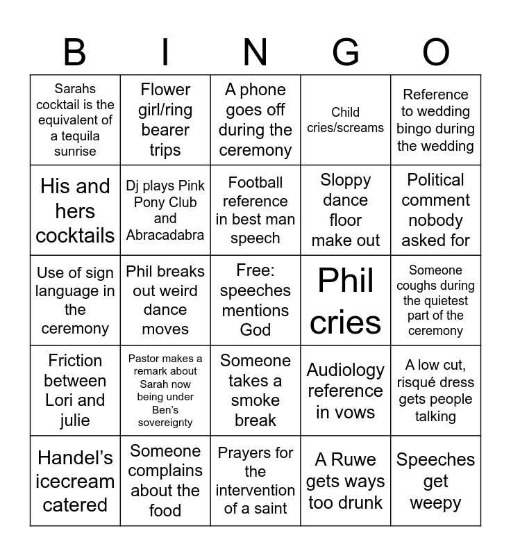 This bingo card has a free space and 25 words: Pastor makes a remark about Sarah now being under Ben’s sovereignty, Prayers for the intervention of a saint, Football reference in best man speech, Handel’s icecream catered, Reference to wedding bingo during the wedding, Sarahs cocktail is the equivalent of a tequila sunrise, His and hers cocktails, Flower girl/ring bearer trips, Phil cries, Someone takes a smoke break, Sloppy dance floor make out, Use of sign language in the ceremony, Audiology reference in vows, A low cut, risqué dress gets people talking, Dj plays Pink Pony Club and Abracadabra, Julia gets misgendered, Someone coughs during the quietest part of the ceremony, A phone goes off during the ceremony, Political comment nobody asked for, Phil breaks out weird dance moves, Speeches get weepy, Someone complains about the food, Friction between Lori and julie, Child cries/screams and A Ruwe gets ways too drunk.