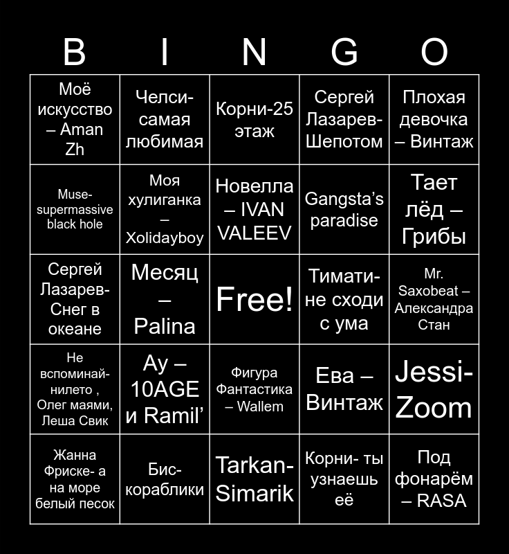 This bingo card has a free space and 28 words: Jessi- Zoom, Дима Билан- Не молчи, Gangsta’s paradise, Корни- ты узнаешь её, Muse- supermassive black hole, Корни-25 этаж, Челси- самая любимая, Не вспоминай- нилето , Олег маями, Леша Свик, Тимати- не сходи с ума, Жанна Фриске- а на море белый песок, Сергей Лазарев- Снег в океане, Сергей Лазарев- Шепотом, Бис- кораблики, Tarkan- Simarik, Тает лёд – Грибы, Оптимист – Макс Корж, Ау – 10AGE и Ramil’, Моя хулиганка – Xolidayboy, Новелла – IVAN VALEEV, Фигура Фантастика – Wallem, Моё искусство – Aman Zh, Малиновая Лада – Gayazovs Brothers, Под фонарём – RASA, Месяц – Palina, Mr. Saxobeat – Александра Стан, Ева – Винтаж, Плохая девочка – Винтаж and Крошка моя – Руки Вверх.