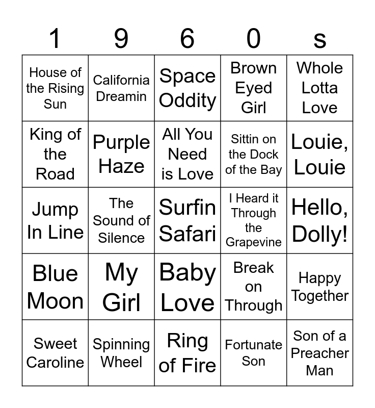This bingo card has 50 words: Stand By Me, Surfin Safari, The Lion Sleeps Tonight, Ring of Fire, My Girl, Paint it Black, California Dreamin, I Got You Babe, King of the Road, I'm a Believer, Purple Haze, Brown Eyed Girl, Happy Together, Break on Through, Born to be Wild, Unchained Melody, All You Need is Love, I Heard it Through the Grapevine, Like a Rolling Stone, Whole Lotta Love, The Sound of Silence, Fortunate Son, House of the Rising Sun, Sittin on the Dock of the Bay, Me and Bobby McGee, Son of a Preacher Man, Louie, Louie, At Last, Space Oddity, Baby Love, Sugar, Sugar, Respect, Somebody to Love, Feeling Good, Spinning Wheel, Build me up Buttercup, When a Man Loves a Woman, It’s not Unusual, Stop! In the Name of Love, Hello, Dolly!, These Boots are Made for Walkin, Soul Man, Everyday People, You Really Got Me, Sweet Caroline, Jump In Line, Sunshine of Your Love, Chapel of Love, Blue Moon and Monster Mash.