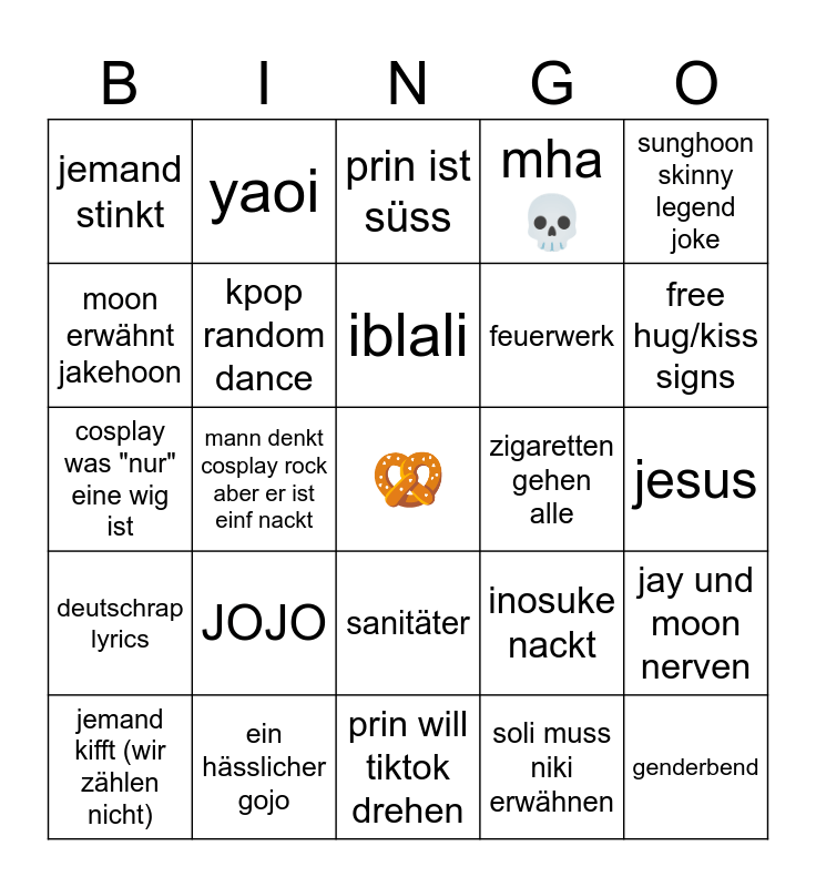 This bingo card has a free space and 24 words: JOJO, ein hässlicher gojo, iblali, jemand kifft (wir zählen nicht), sunghoon skinny legend joke, jemand stinkt, moon erwähnt jakehoon, yaoi, zigaretten gehen alle, sanitäter, feuerwerk, cosplay was "nur" eine wig ist, inosuke nackt, jay und moon nerven, kpop random dance, soli muss niki erwähnen, jesus, prin ist süss, free hug/kiss signs, mann denkt cosplay rock aber er ist einf nackt, genderbend, deutschrap lyrics, mha💀 and prin will tiktok drehen.