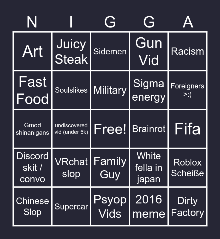 This bingo card has a free space and 24 words: Chinese Slop, VRchat slop, Military, 2016 meme, Racism, Art, Juicy Steak, Sidemen, Brainrot, Fifa, Gmod shinanigans, Soulslikes, White fella in japan, Roblox Scheiße, Fast Food, Supercar, Psyop Vids, Gun Vid, Foreigners >:(, Discord skit / convo, undiscovered vid (under 5k), Family Guy, Sigma energy and Dirty Factory.