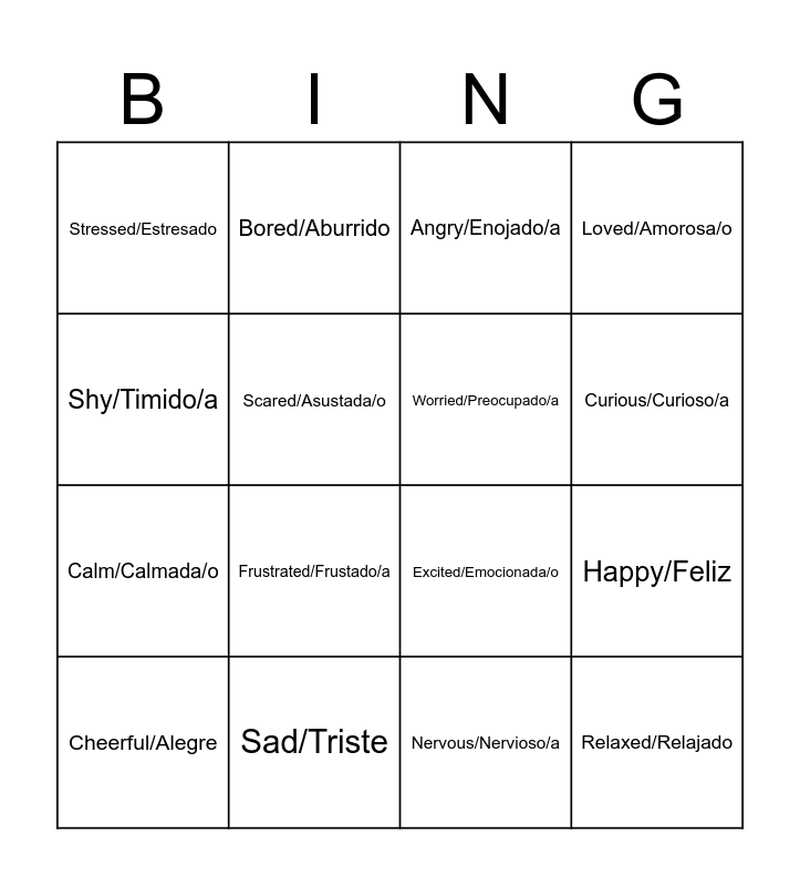 This bingo card has 16 words: Sad/Triste, Happy/Feliz, Angry/Enojado/a, Stressed/Estresado, Calm/Calmada/o, Bored/Aburrido, Excited/Emocionada/o, Nervous/Nervioso/a, Shy/Timido/a, Scared/Asustada/o, Cheerful/Alegre, Loved/Amorosa/o, Frustrated/Frustado/a, Curious/Curioso/a, Worried/Preocupado/a and Relaxed/Relajado.