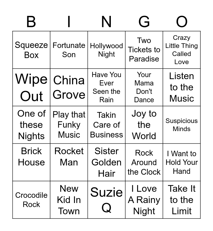 This bingo card has a free space and 34 words: Old Time Rock N Roll, I Love A Rainy Night, Cecilia, The Best of My Love, Brick House, China Grove, Crazy Little Thing Called Love, Crocodile Rock, Fortunate Son, A Hard Day's Night, Have You Ever Seen the Rain, Hollywood Night, Into the Mystic, Jailhouse Rock, Joy to the World, Listen to the Music, New Kid In Town, One of these Nights, Rocket Man, Rock Around the Clock, Sister Golden Hair, Small Town, Squeeze Box, Suspicious Minds, Suzie Q, Take It to the Limit, Two Tickets to Paradise, Witchy Woman, Your Mama Don't Dance, Wipe Out, Rock Around the Clock, Play that Funky Music, I Want to Hold Your Hand and Doctor of My Eyes.