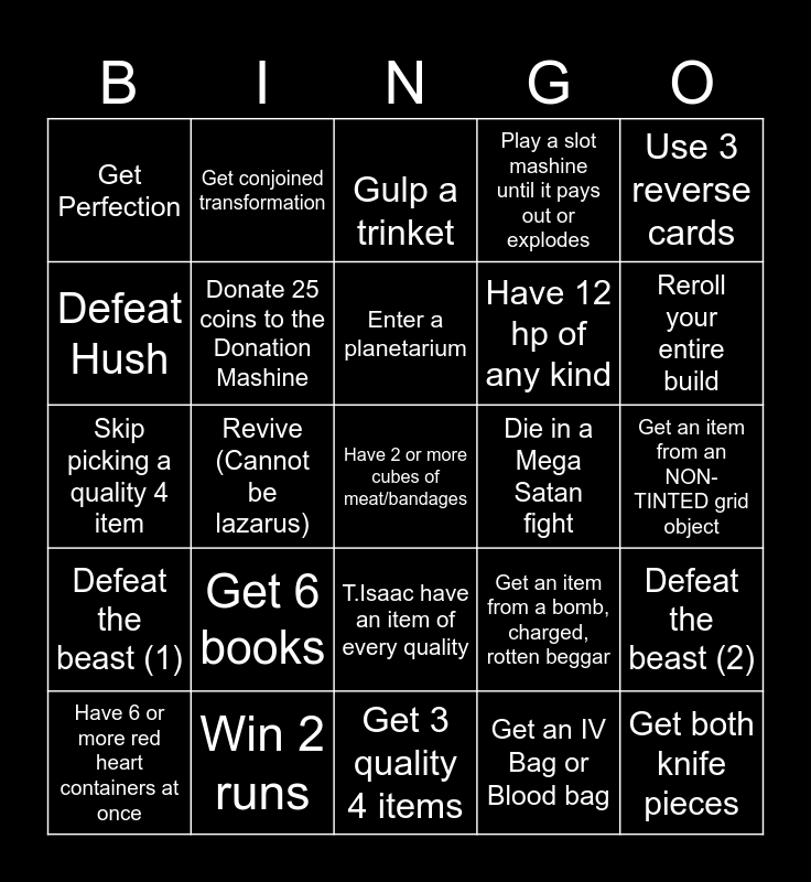 This bingo card has a free space and 24 words: Get 6 books, Win 2 runs, Enter a planetarium, Have 6 or more red heart containers at once, Use 3 reverse cards, Get Perfection, Defeat Hush, Get conjoined transformation, Die in a Mega Satan fight, T.Isaac have an item of every quality, Have 12 hp of any kind, Skip picking a quality 4 item, Get an item from a bomb, charged, rotten beggar, Defeat the beast (2), Donate 25 coins to the Donation Mashine, Get an IV Bag or Blood bag, Get an item from an NON-TINTED grid object, Gulp a trinket, Reroll your entire build, Revive (Cannot be lazarus), Get both knife pieces, Defeat the beast (1), Play a slot mashine until it pays out or explodes and Get 3 quality 4 items.