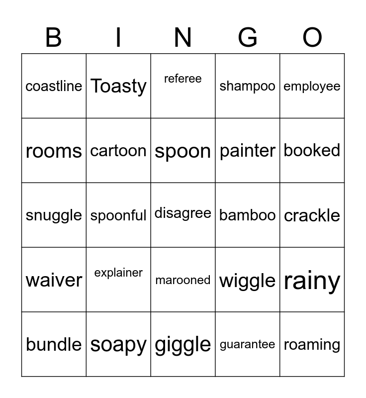 This bingo card has a free space and 24 words: explainer, soapy, spoon, bundle, employee, coastline, rooms, Toasty, bamboo, marooned, painter, snuggle, wiggle, rainy, cartoon, guarantee, crackle, referee, booked, spoonful, roaming, waiver, shampoo and giggle.