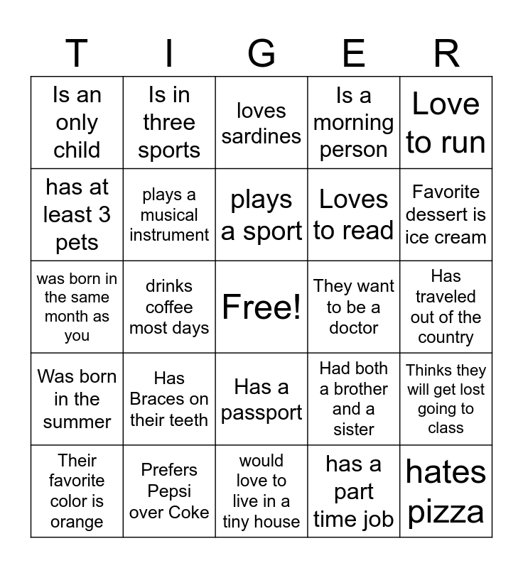 This bingo card has a free space and 24 words: Has Braces on their teeth, Prefers Pepsi over Coke, plays a sport, Their favorite color is orange, Love to run, Is an only child, has at least 3 pets, Is in three sports, They want to be a doctor, Has a passport, Loves to read, was born in the same month as you, Had both a brother and a sister, Thinks they will get lost going to class, plays a musical instrument, has a part time job, Has traveled out of the country, loves sardines, Favorite dessert is ice cream, drinks coffee most days, hates pizza, Was born in the summer, Is a morning person and would love to live in a tiny house.