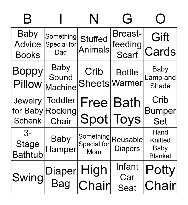This bingo card has a free space and 24 words: Baby Hamper, Diaper Bag, Crib Sheets, Swing, Gift Cards, Baby Advice Books, Boppy Pillow, Something Special for Dad, Bath Toys, Something Special for Mom, Bottle Warmer, Jewelry for Baby Schenk, Reusable Diapers, Hand Knitted Baby Blanket, Baby Sound Machine, Infant Car Seat, Crib Bumper Set, Stuffed Animals, Baby Lamp and Shade, Toddler Rocking Chair, Potty Chair, 3-Stage Bathtub, Breast-feeding Scarf and High Chair.