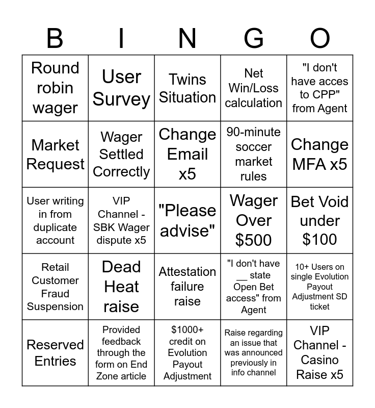 This bingo card has a free space and 58 words: Incorrect User ID, Provided feedback through the form on End Zone article, Tagging the Support Analyst team in an ongoing issue, Retail Customer Fraud Suspension, Raise regarding an issue that was announced previously in info channel, No research link, Wager Settled Correctly, Loss Limits explanation, 90-minute soccer market rules, Directing agent to raise issue to RG, Net Win/Loss calculation, Help the same agent twice in 1 day, Enter an Agent Feedback submission x5, Settlement delay raise to Traders x5, Slot Machine raise x5, Round robin wager, VIP Channel - Casino Raise x5, "I don't have acces to CPP" from Agent, Directing agent to raise issue to Fraud, Change Email x5, Wager Over $500, Twins Situation, Reserved Entries, 10+ Users on single Evolution Payout Adjustment SD ticket, Incorrect Case Number, Bet Void under $100, Live Dealer raise x5, Reward Machine raise, Change MFA x5, Picks Raise in cs-picks-help, Customer with same birth year, Cricket wager, Unnecessary DFS Settlement Request, Deceased Verification Override, Puerto Rico Retail Raise, Global Deposit Limits explanation, Wager Limits explanation, VIP Channel - SBK Wager dispute x5, User writing in from duplicate account, Post an ask to the Game Ops team, Dead Heat raise, Discover a textbook copy/paste job (to or fro) - ewww, "I don't have __ state Open Bet access" from Agent, "I don't have access to Geocomply" from Agent, Handle duplicate raise (user that was raised earlier that day by different agent), Directing agent to raise issue to Payments, Resettlement raise to Traders x5, Attestation failure raise, $1000+ credit on Evolution Payout Adjustment, User device blocked due to 4+ shared users, Own the Outcome on Mohegan Sun email, Handle 10+ Alley Oop sessions in a single 2-hour block, Slack Raise for user in Wyoming, "Quick Question", User Survey, No Profile Picture in Slack x5, Market Request and Huff & Even More Puff.
