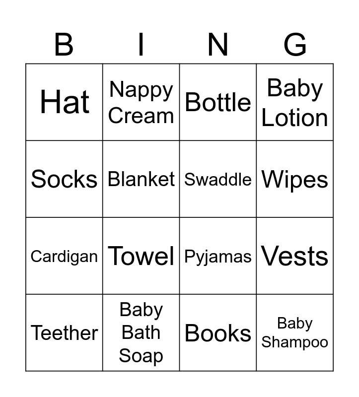 This bingo card has 24 words: Dummy, Nappies, Wipes, Baby grow, Socks, Hat, Blanket, Nappy Cream, Baby Bath Soap, Toys, Cardigan, Pyjamas, Muslin Cloth, Rattle, Swaddle, Bibs, Books, Bottle, Towel, Vests, Teether, Baby Shampoo, Baby Lotion and Baby Powder.