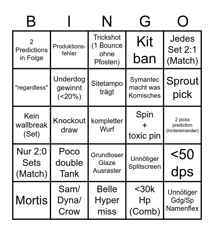 This bingo card has 25 words: Poco double Tank, Belle Hyper miss, Sitetampo trägt, Mortis, Jedes Set 2:1 (Match), 2 Predictions in Folge, "regardless", Produktions- fehler, Spin + toxic pin, Grundloser Glaze Ausraster, Symantec macht was Komisches, Kein wallbreak (Set), Unnötiger Splitscreen, <50 dps, Underdog gewinnt (<20%), Unnötiger Gdg/Sp Namenflex, 2 picks prediction (hintereinander), Trickshot (1 Bounce ohne Pfosten), Sprout pick, Knockout draw, kompletter Wurf, Sam/ Dyna/ Crow, Nur 2:0 Sets (Match), Kit ban and <30k Hp (Comb).