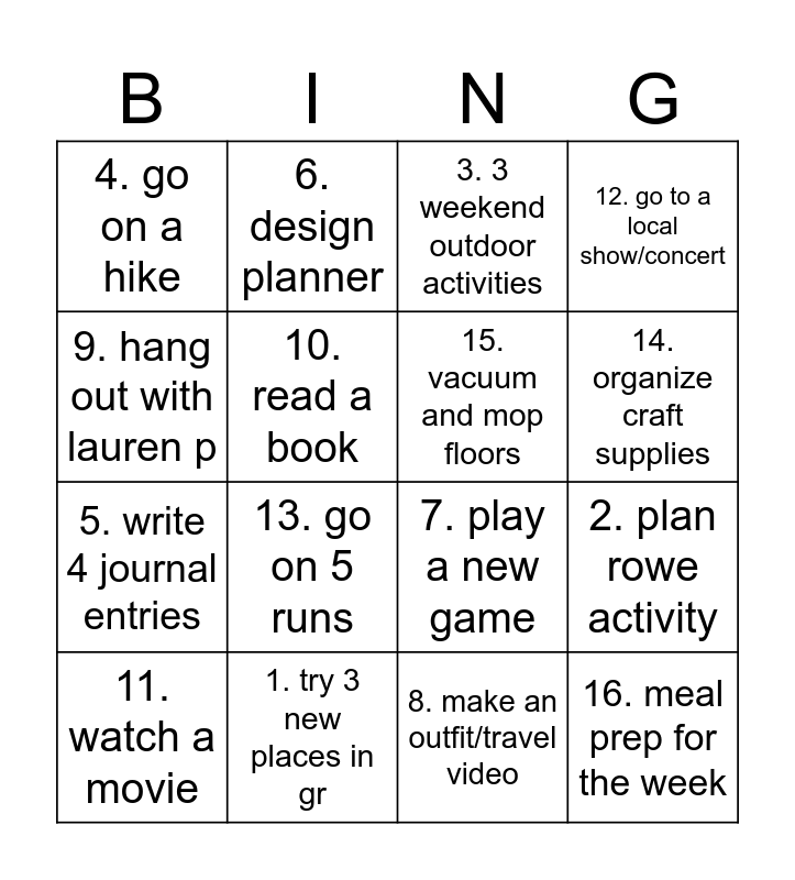 This bingo card has 16 words: 1. try 3 new places in gr, 2. plan rowe activity, 3. 3 weekend outdoor activities, 4. go on a hike, 5. write 4 journal entries, 6. design planner, 7. play a new game, 8. make an outfit/travel video, 9. hang out with lauren p, 10. read a book, 11. watch a movie, 12. go to a local show/concert, 13. go on 5 runs, 14. organize craft supplies, 15. vacuum and mop floors and 16. meal prep for the week.