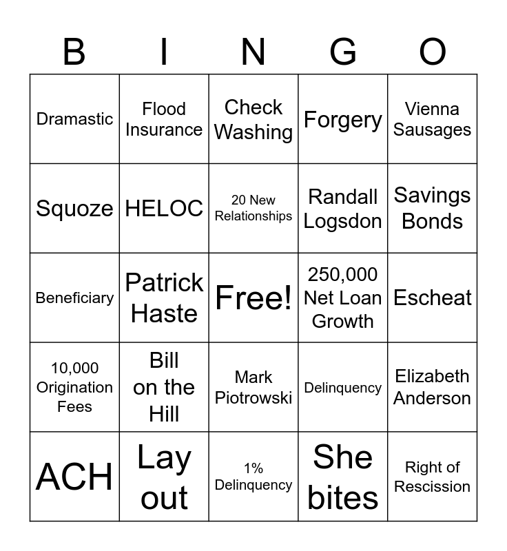 This bingo card has a free space and 29 words: ACH, Amortization, Patrick Haste, 12 Sales Calls, Dramastic, Check Washing, HELOC, Bill on the Hill, 250,000 Net Loan Growth, Lay out, Escheat, Right of Rescission, 1% Delinquency, She bites, Savings Bonds, Credit Application, Mark Piotrowski, 10,000 Origination Fees, Vienna Sausages, Beneficiary, Delinquency, Melissa Sims, Randall Logsdon, Squoze, Forgery, Flood Insurance, Elizabeth Anderson, 20 New Relationships and Sarup.