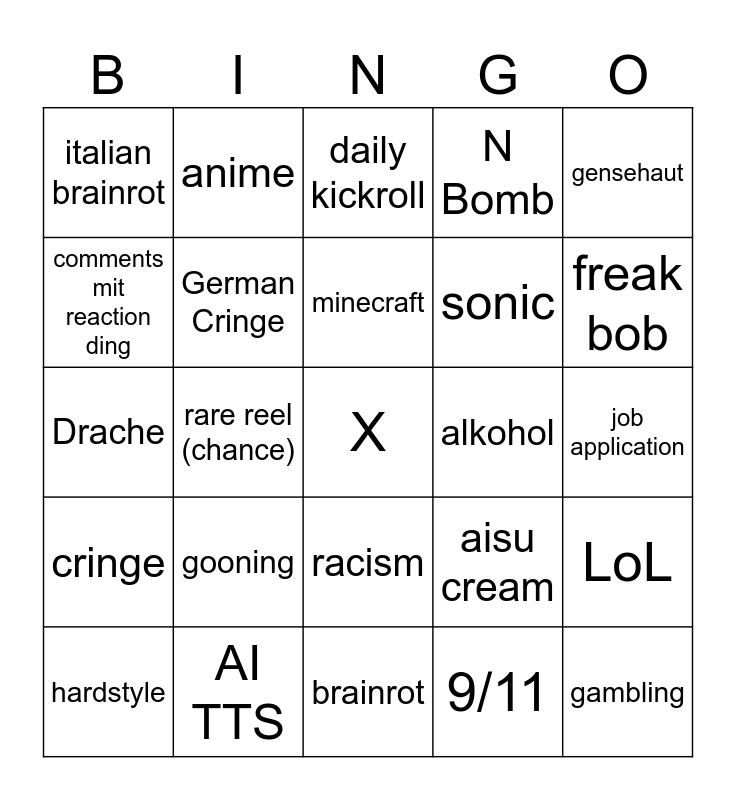 This bingo card has a free space and 32 words: katze, AI TTS, brainrot, Miku, freak bob, italian brainrot, rare reel (chance), racism, N Bomb, gambling, comments mit reaction ding, anime, 9/11, Goth, cringe, Phonk, white monster, alkohol, job application, hardstyle, gooning, yo: gurt, aisu cream, LoL, Drache, German Cringe, daily kickroll, sonic, gensehaut, daily video, metal and minecraft.