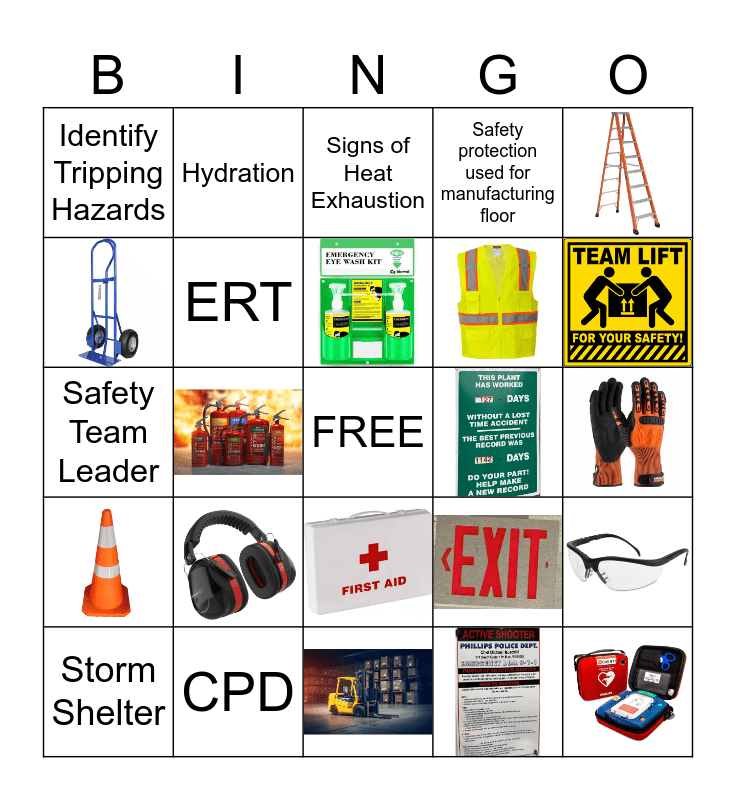 This bingo card has 16 images, a free space and 8 words: CPD, Storm Shelter, Identify Tripping Hazards, Hydration, Safety Team Leader, ERT, Signs of Heat Exhaustion and Safety protection used for manufacturing floor.