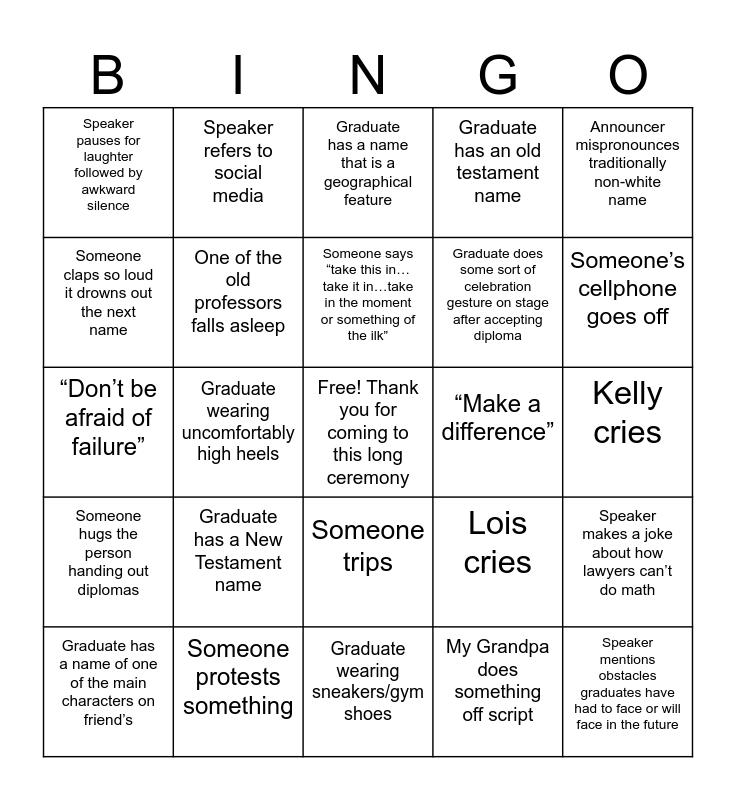 This bingo card has a free space and 26 words: Someone trips, My Grandpa does something off script, Someone says “take this in…take it in…take in the moment or something of the ilk”, Someone protests something, Announcer mispronounces traditionally non-white name, Speaker pauses for laughter followed by awkward silence, Someone claps so loud it drowns out the next name, Speaker refers to social media, Kelly cries, Lois cries, Graduate does some sort of celebration gesture on stage after accepting diploma, “Don’t be afraid of failure”, Speaker makes a joke about how lawyers can’t do math, Graduate has a name of one of the main characters on friend’s, Graduate wearing uncomfortably high heels, someone sneezes super loudly, Graduate has an old testament name, Someone hugs the person handing out diplomas, Graduate has a name that is a geographical feature, Speaker mentions obstacles graduates have had to face or will face in the future, Someone’s cellphone goes off, Graduate wearing sneakers/gym shoes, “Make a difference”, Graduate has a New Testament name, One of the old professors falls asleep and Graduate wears scarf over gown often seen at protests.