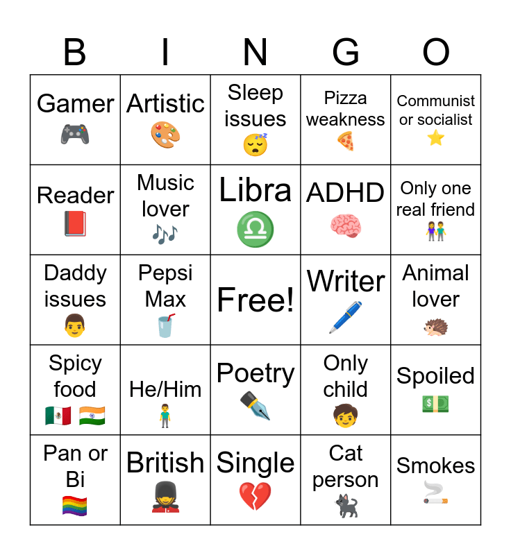This bingo card has a free space and 24 words: He/Him ๐งโโ๏ธ, British ๐, Libra โ, Pan or Bi ๐ณ๏ธโ๐, Communist or socialist โญ, Gamer ๐ฎ, Reader ๐, Artistic ๐จ, Writer ๐๏ธ, Poetry โ๏ธ, ADHD ๐ง , Daddy issues ๐จ, Only child ๐ง, Spoiled ๐ต, Music lover ๐ถ, Cat person ๐โโฌ, Animal lover ๐ฆ, Sleep issues ๐ด, Only one real friend ๐ซ, Pepsi Max ๐ฅค, Smokes ๐ฌ, Spicy food ๐ฒ๐ฝ ๐ฎ๐ณ, Pizza weakness ๐ and Single ๐.
