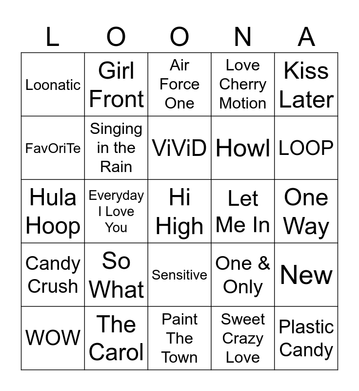 This bingo card has 50 words: Butterfly, Hi High, Heart Attack, Paint The Town, So What, Why Not?, Girl Front, Love4eva, FavOriTe, Eclipse, Singing in the Rain, Love Cherry Motion, New, One & Only, Egoist, Star, ViViD, Let Me In, Around You, Kiss Later, Everyday I Love You, Sweet Crazy Love, Loonatic, Howl, Algorithm, Plastic Candy, LOOP, Virtual Angel, Air Force One, Sensitive, Girls’ Night, Sonatine, I'll Be There, Love & Live, The Carol, Puzzle, Girl's Talk, See Saw, Rosy, One Way, Heat, Curiosity, Oh (Yes I Am), Voice, WOW, Hula Hoop, Strawberry Rush, Flower Rhythm, Candy Crush and Birth.