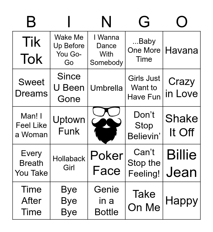 This bingo card has a free space and 28 words: Billie Jean, Like a Prayer, Girls Just Want to Have Fun, Take On Me, Sweet Dreams, I Wanna Dance With Somebody, Wake Me Up Before You Go-Go, Every Breath You Take, Don’t Stop Believin’, Time After Time, Man! I Feel Like a Woman, ...Baby One More Time, Bye Bye Bye, Genie in a Bottle, Crazy in Love, Hey Ya!, Hollaback Girl, Since U Been Gone, Umbrella, Poker Face, Tik Tok, Blurred Lines, Happy, Uptown Funk, Shake It Off, Can’t Stop the Feeling!, Havana and Thank U, Next.