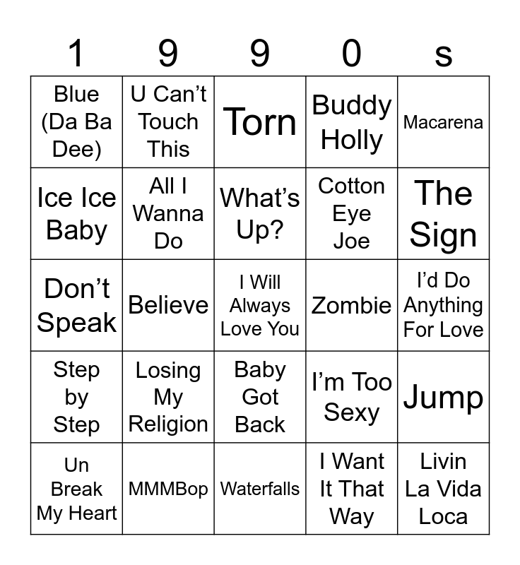 This bingo card has 50 words: Smells Like Teen Spirit, I Will Always Love You, Vogue, Waterfalls, Losing My Religion, Ironic, U Can’t Touch This, Enter Sandman, Ice Ice Baby, Only Wanna Be With You, All I Wanna Do, Buddy Holly, Jump, I’m Too Sexy, Achy Breaky Heart, I Can’t Make You Love Me, What’s Up?, Zombie, Sandstorm, Macarena, Believe, I Want It That Way, Blue (Da Ba Dee), Cotton Eye Joe, Gettin’ Jiggy Wit It, Livin La Vida Loca, The Sign, Tubthumping, Torn, Baby Got Back, I’ll Be There for You, Shoop, Breakfast at Tiffany’s, My Heart Will Go On, MMMBop, Mambo No. 5, Song 2, Wannabe, No Rain, I’d Do Anything For Love, Barbie Girl, What Is Love?, Any Man Of Mine, Boot Scootin’ Boogie, Un Break My Heart, Don’t Speak, Wonderwall, Get Ready, Step by Step and Life is a Highway.