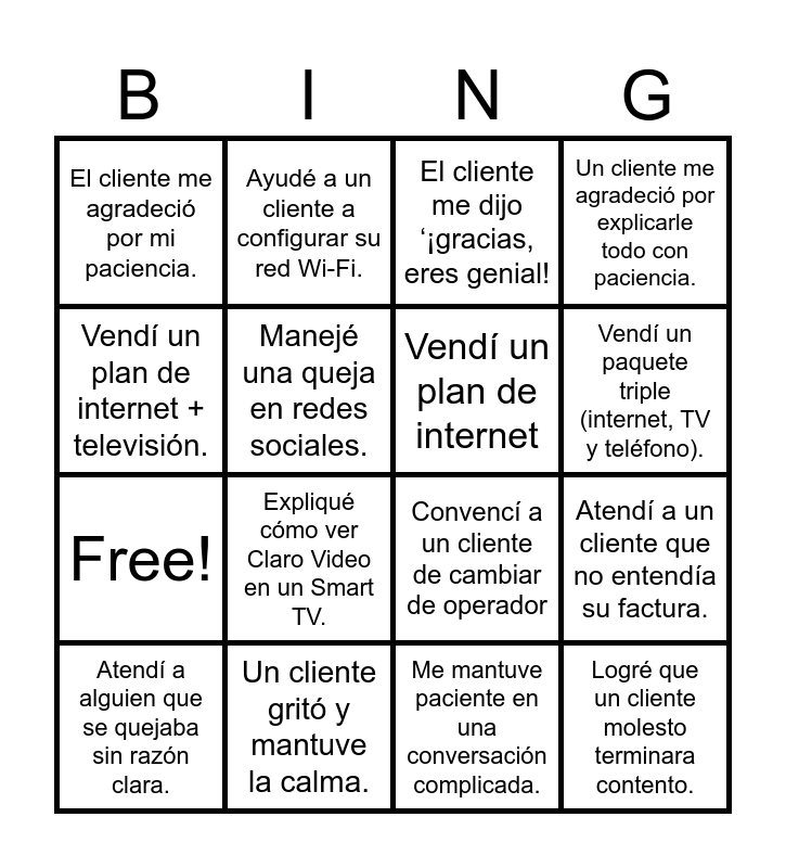 This bingo card has 20 words: Atendí a un cliente que no entendía su factura., Logré vender un paquete con más megas del que el cliente buscaba., El cliente me dijo ‘¡gracias, eres genial!, Recibí felicitaciones de un cliente., Atendí a alguien que se quejaba sin razón clara., Vendí un plan de internet + televisión., Un cliente gritó y mantuve la calma., El cliente me agradeció por mi paciencia., Free!, Ayudé a un cliente a configurar su red Wi-Fi., Expliqué cómo ver Claro Video en un Smart TV., Convencí a un cliente de cambiar de operador, Manejé una queja en redes sociales., Logré que un cliente molesto terminara contento., Vendí un plan de internet, Guie al cliente para reiniciar su módem., Vendí un paquete triple (internet, TV y teléfono)., Un cliente me agradeció por explicarle todo con paciencia., Me mantuve paciente en una conversación complicada. and Tomé una pausa para respirar antes de responder..