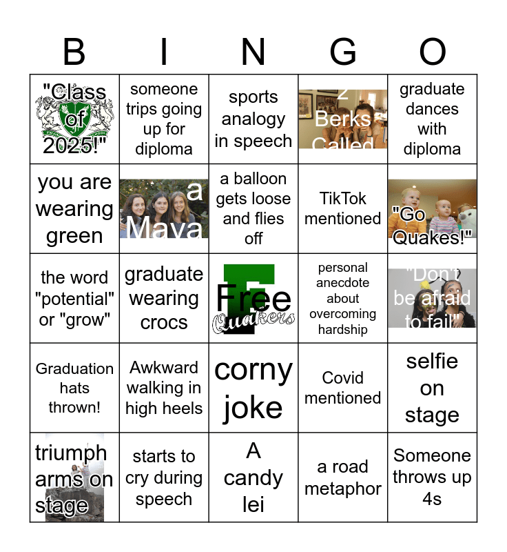This bingo card has 6 images, a free space and 24 words: Awkward walking in high heels, starts to cry during speech, a balloon gets loose and flies off, triumph arms on stage, graduate dances with diploma, "Class of 2025!", you are wearing green, someone trips going up for diploma, personal anecdote about overcoming hardship, corny joke, TikTok mentioned, the word "potential" or "grow", Covid mentioned, selfie on stage, a Maya, a road metaphor, "Don't be afraid to fail", sports analogy in speech, "Go Quakes!", graduate wearing crocs, Someone throws up 4s, Graduation hats thrown!, 2 Berks Called and A candy lei.