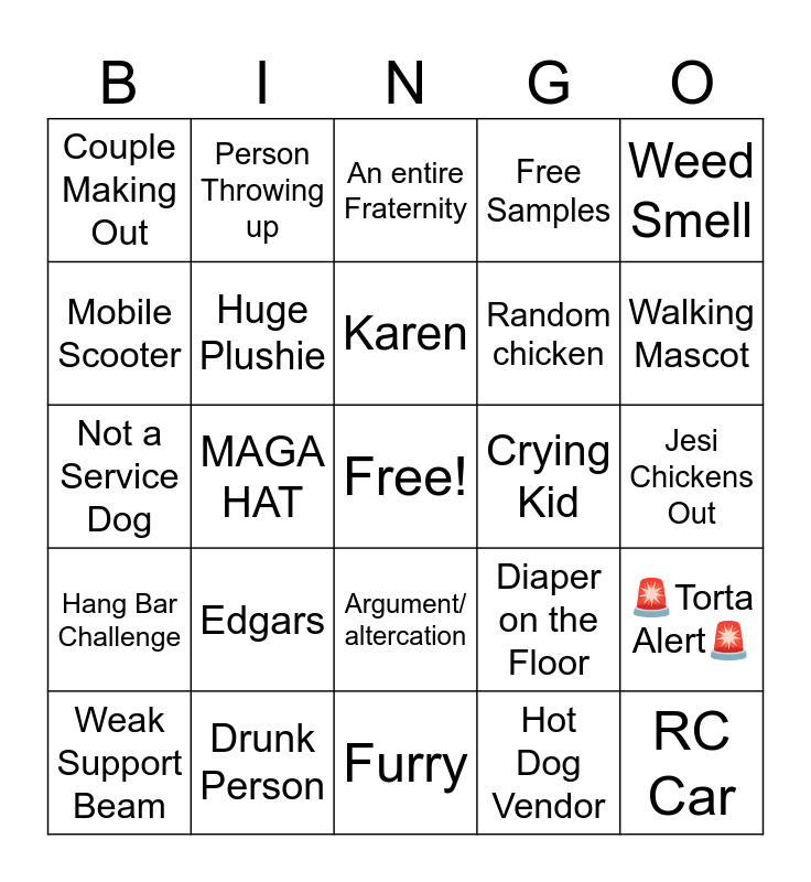 This bingo card has a free space and 24 words: Edgars, Drunk Person, Karen, Weak Support Beam, Weed Smell, Couple Making Out, Mobile Scooter, Person Throwing up, Crying Kid, Argument/ altercation, Random chicken, Not a Service Dog, Diaper on the Floor, 🚨Torta Alert🚨, Huge Plushie, Hot Dog Vendor, Jesi Chickens Out, An entire Fraternity, Walking Mascot, MAGA HAT, RC Car, Hang Bar Challenge, Free Samples and Furry.