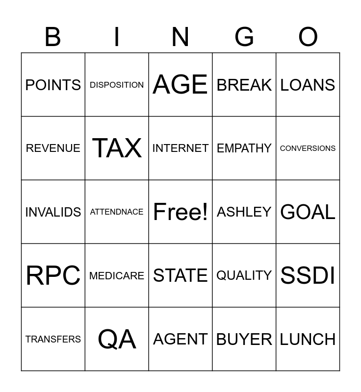 This bingo card has a free space and 37 words: ACA, ENERGY, DEBT, TAX, SSDI, MEDICARE, INTERNET, EDU, LOANS, BONUS, ATTENDNACE, BREAK, LUNCH, GOAL, REVENUE, RPC, STATS, AGE, STATE, ASHLEY, POINTS, CONVERSIONS, TRANSFERS, AGENT, MEMBER, BUYER, DISPOSITION, COFFEE BREAK, LATE, RESPECT, LEADER, QA, INVALIDS, HANDSHAKE, QUALITY, EMPATHY and TONAILTY.