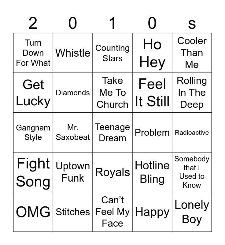 This bingo card has 50 words: 24K Magic, Teenage Dream, What Makes You Beautiful, Can’t Feel My Face, Uptown Funk, I Knew You Were Trouble, Whistle, Rude, Get Lucky, Fireball, Diamonds, Ho Hey, Somebody that I Used to Know, Hotline Bling, All of Me, Stay With Me, Take Me To Church, Problem, Fancy, Cooler Than Me, Mr. Saxobeat, Happy, Turn Down For What, Feel It Still, Cake By The Ocean, Lonely Boy, Rolling In The Deep, Stressed Out, Counting Stars, Royals, Chandelier, Sail, Shape Of You, Despacito, Stitches, Watch Me Whip, Shallow, Old Town Road, Bad Guy, Radioactive, Party Rock Anthem, Fireflies, Girl On Fire, Waka Waka, OMG, Gangnam Style, Tennessee Whiskey, Sweater Weather, Fight Song and Glad You Came.